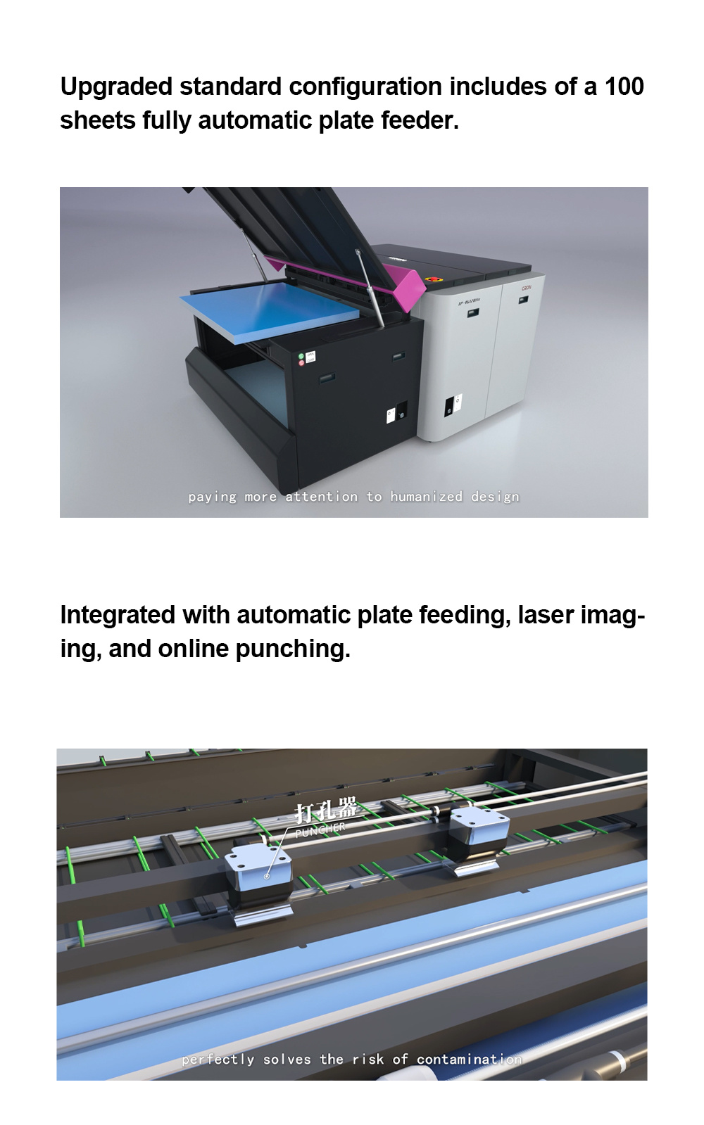 The 46Hn CTP integrates automatic plate supply, laser imaging, and inline punching for high efficiency. Upgraded with a standard 100-sheet fully automatic plate supply unit, it reduces plate loading times, improves efficiency, and saves labor costs. Additionally, it features automatic slip paper sorting and built-in inline punching, accommodating up to 5 sets of punch dies to meet diverse customer needs. Suitable for commercial and newspaper printing, it maintains Core's advantages of high integration, automation, and precision, with resolutions up to 10160dpi, meeting various printing needs.