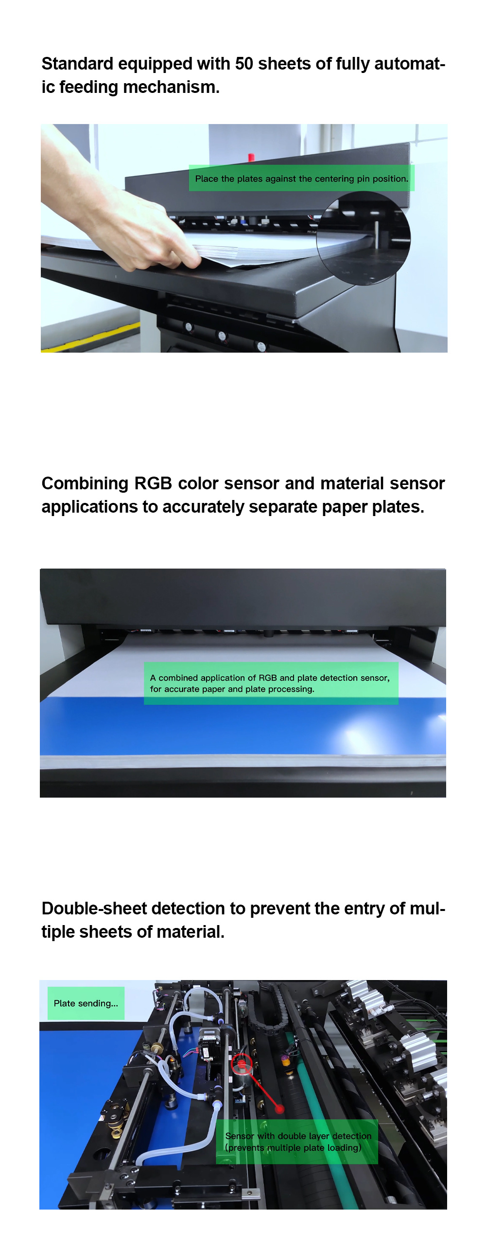 The CRON 36H CTP integrates automatic plate supply, laser imaging, and inline punching, offering stability, simplicity, and efficiency. It's ideal for high-end printing, 3D printing, and anti-counterfeiting. Standard with a 50-sheet fully automatic plate supply system, it features innovative side-pull positioning and nozzle design for smooth plate feeding, along with automated liner removal and plate-loading for enhanced efficiency and reduced labor costs.