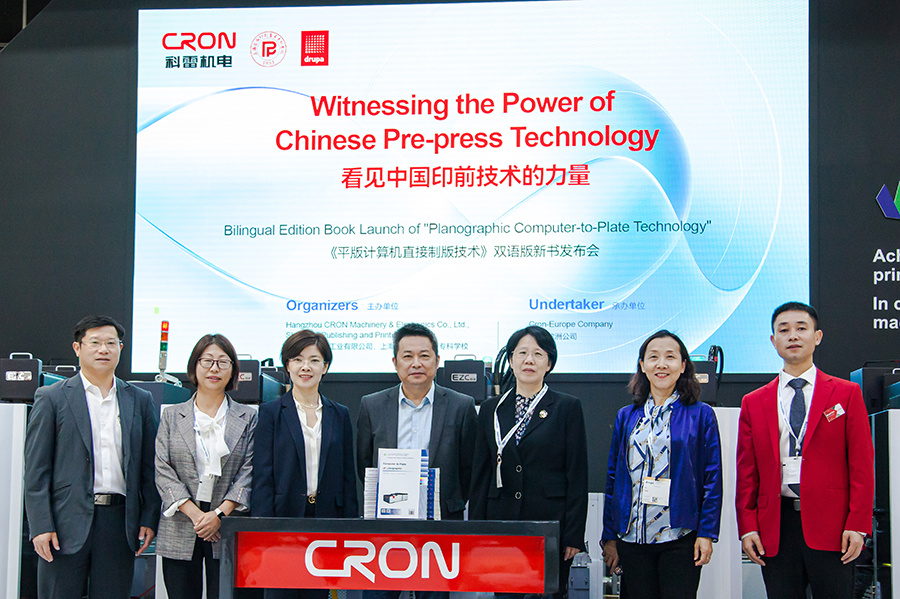 On May 30th, the bilingual edition launch event of " Computer-to-Plate Technology of Lithographic" was held at Drupa, organized by Hangzhou CRON Machinery & Electronics Co., Ltd. and Shanghai Publishing and Printing College. This book co-authored by both institutions, showcases over 30 years of Chinese plate-making technology development, incorporating cutting-edge innovations. It reflects the collaborative efforts and contributions of CRON machinery & Electronic Co., Ltd. and Shanghai Publishing and Printing College to the global and Chinese printing industry!