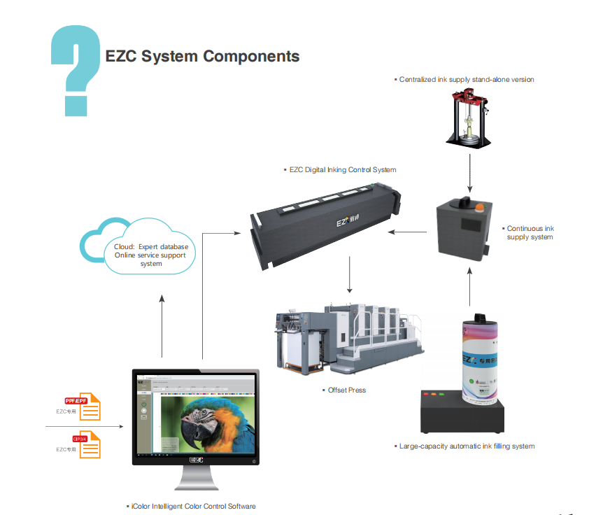 Printing files are imported into the iColor intelligent color control system, where "printing standards" are selected. The expert database precisely calculates the most suitable ink volume online, and the EZC digital ink pump system accurately delivers ink to the offset printing press.
