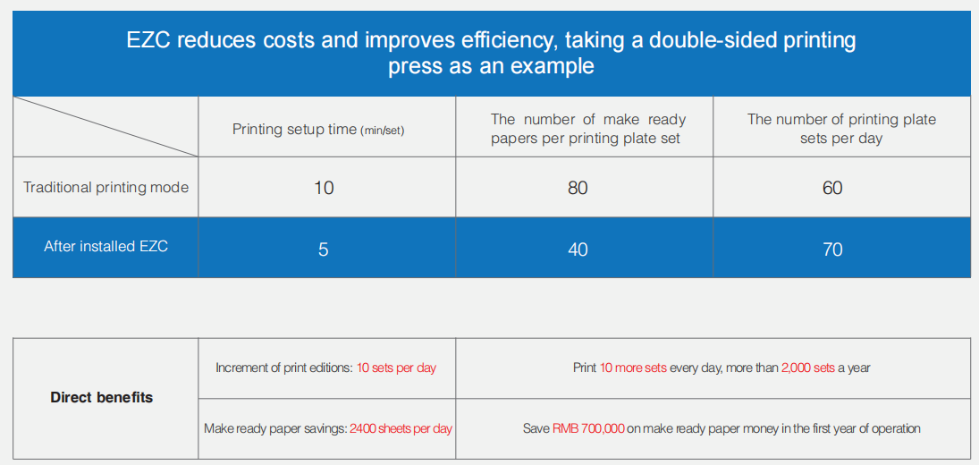 Production costs: Taking a perfecting press as an example, let's assume that a traditional ink fountain requires approximately 80 sheets of make-ready paper for a set of plates. After installing EZC, only about 40 sheets are needed to achieve the printing standard. With 60 jobs per day on one machine, this translates to saving 2,400 sheets of paper. Assuming a cost of 1 RMB per sheet of coated paper and considering 300 working days per year, one machine can save approximately 700,000 RMB in paper costs.
